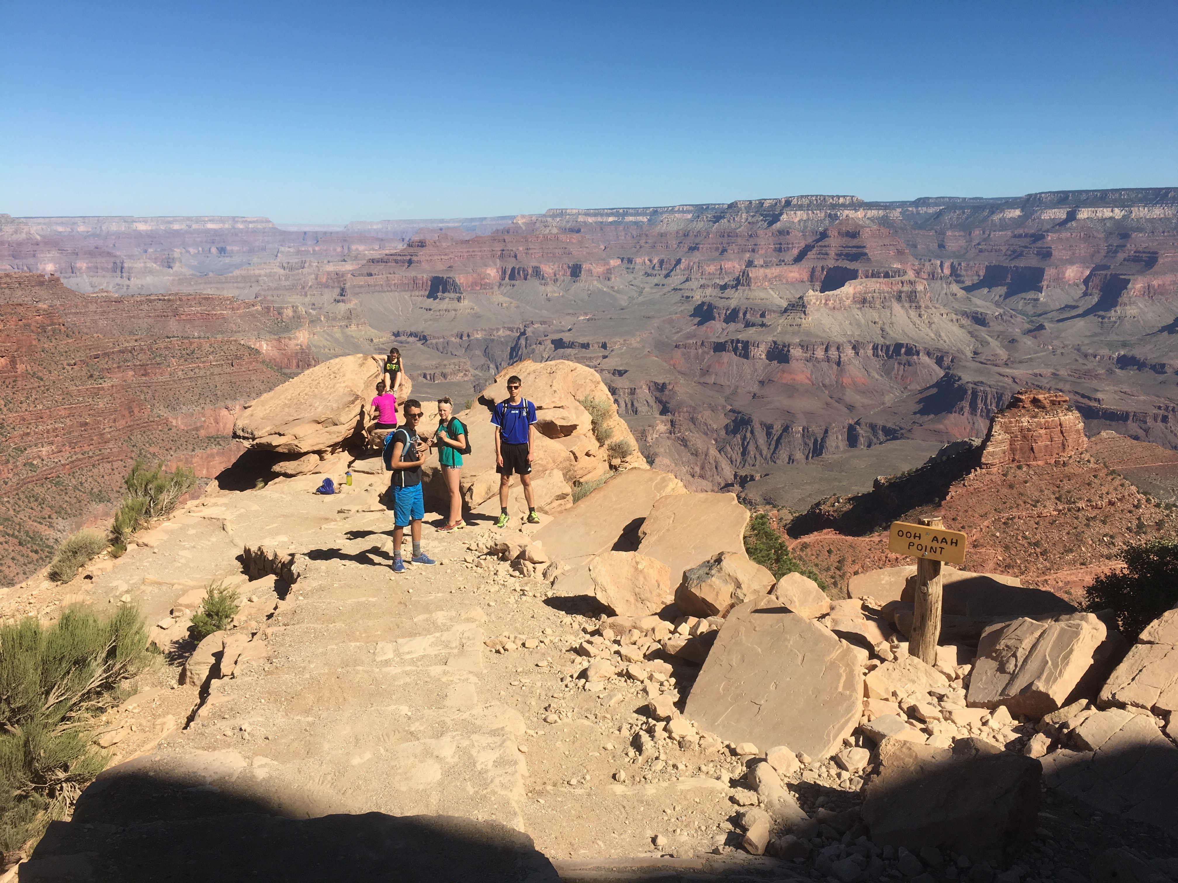 Jakob valgte at blive i camperen, selvom han syntes det var både træls og kedeligt – for at lade hånden få ro. Vi andre tog shuttlebus ud for at gå et stykke af South Kaibab Trail.