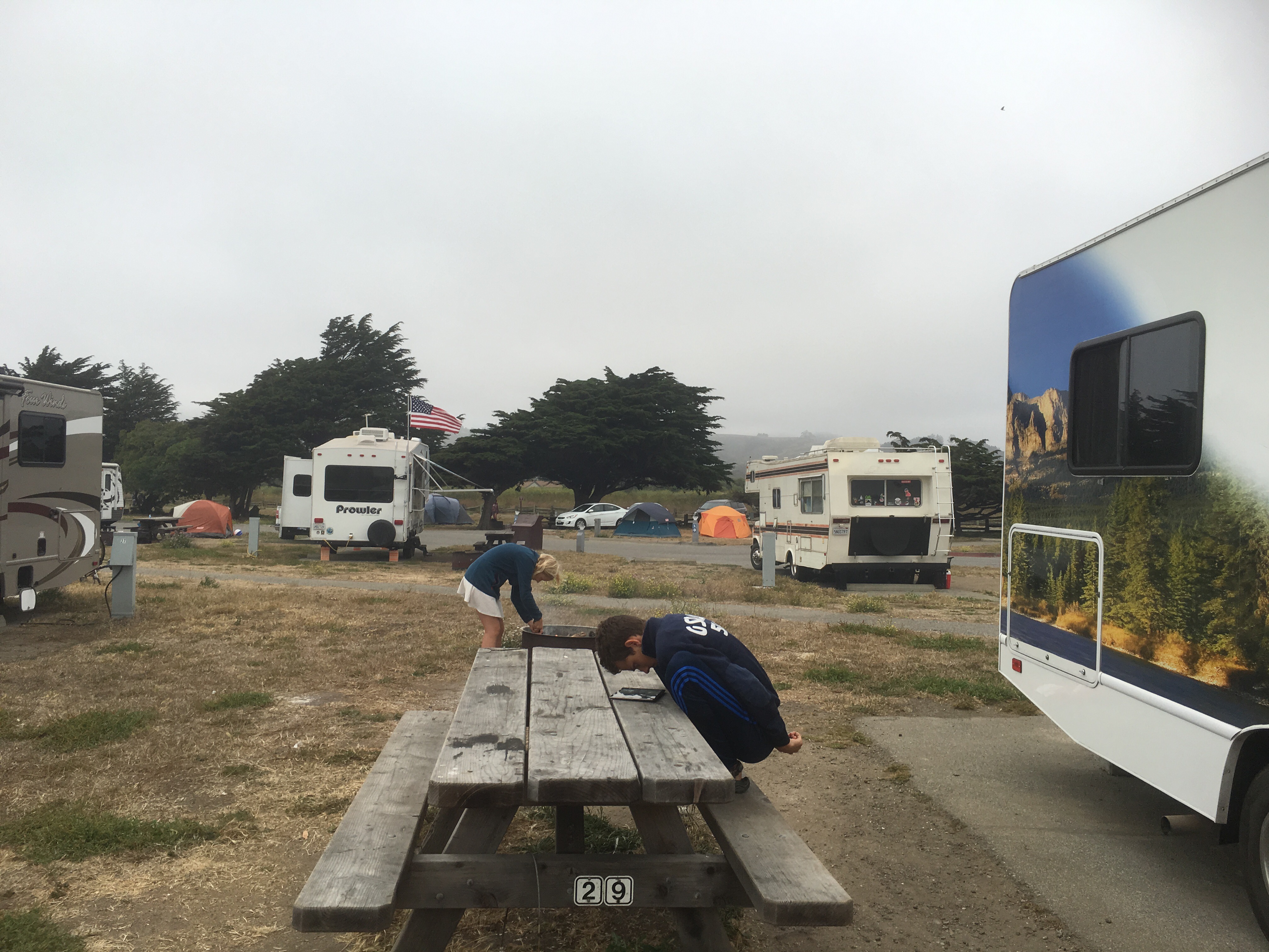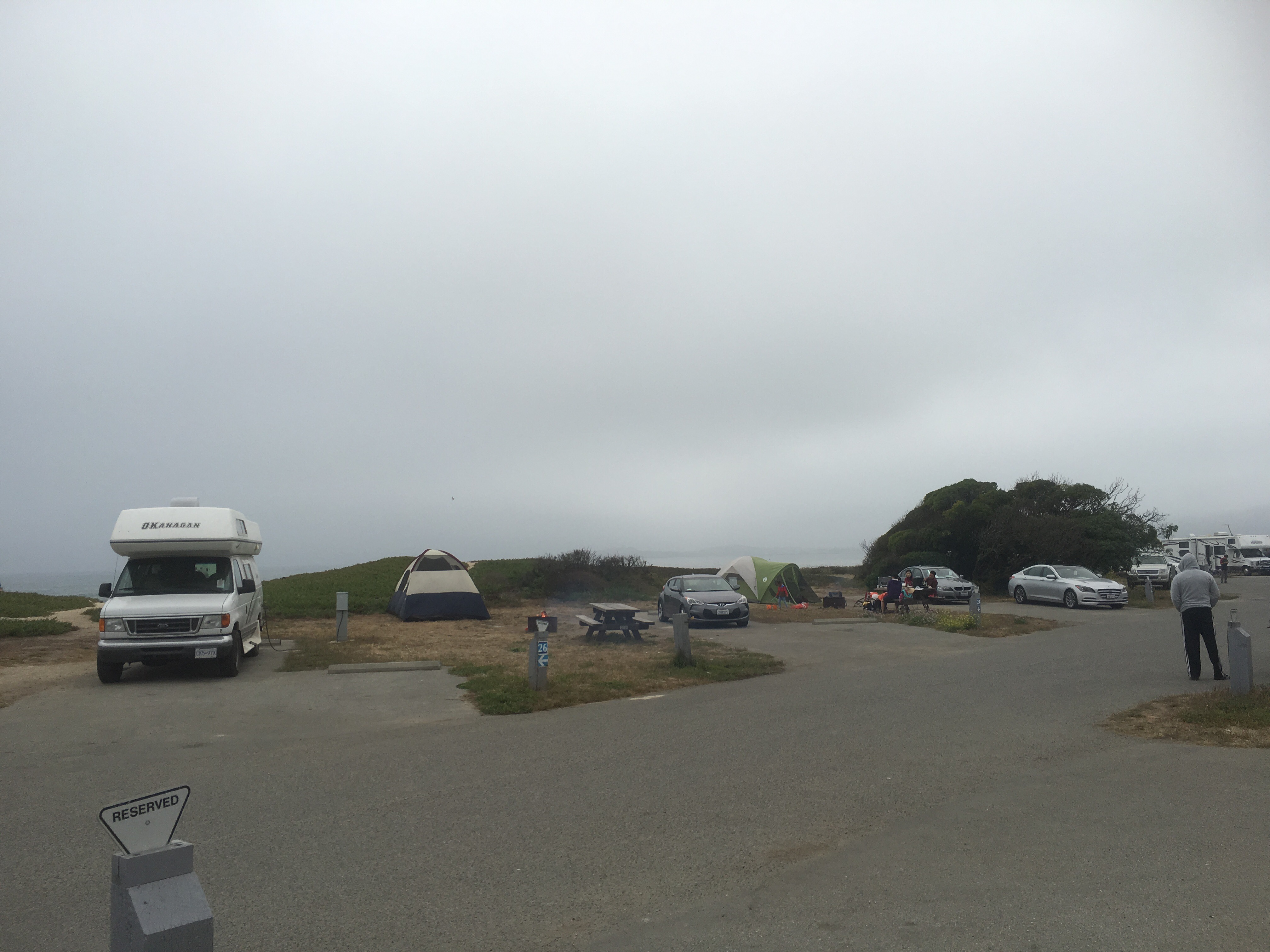 Her i Half Moon Bay er der køligt pga havgus, men det er fint, når man skal rydde op og pakke sammen.