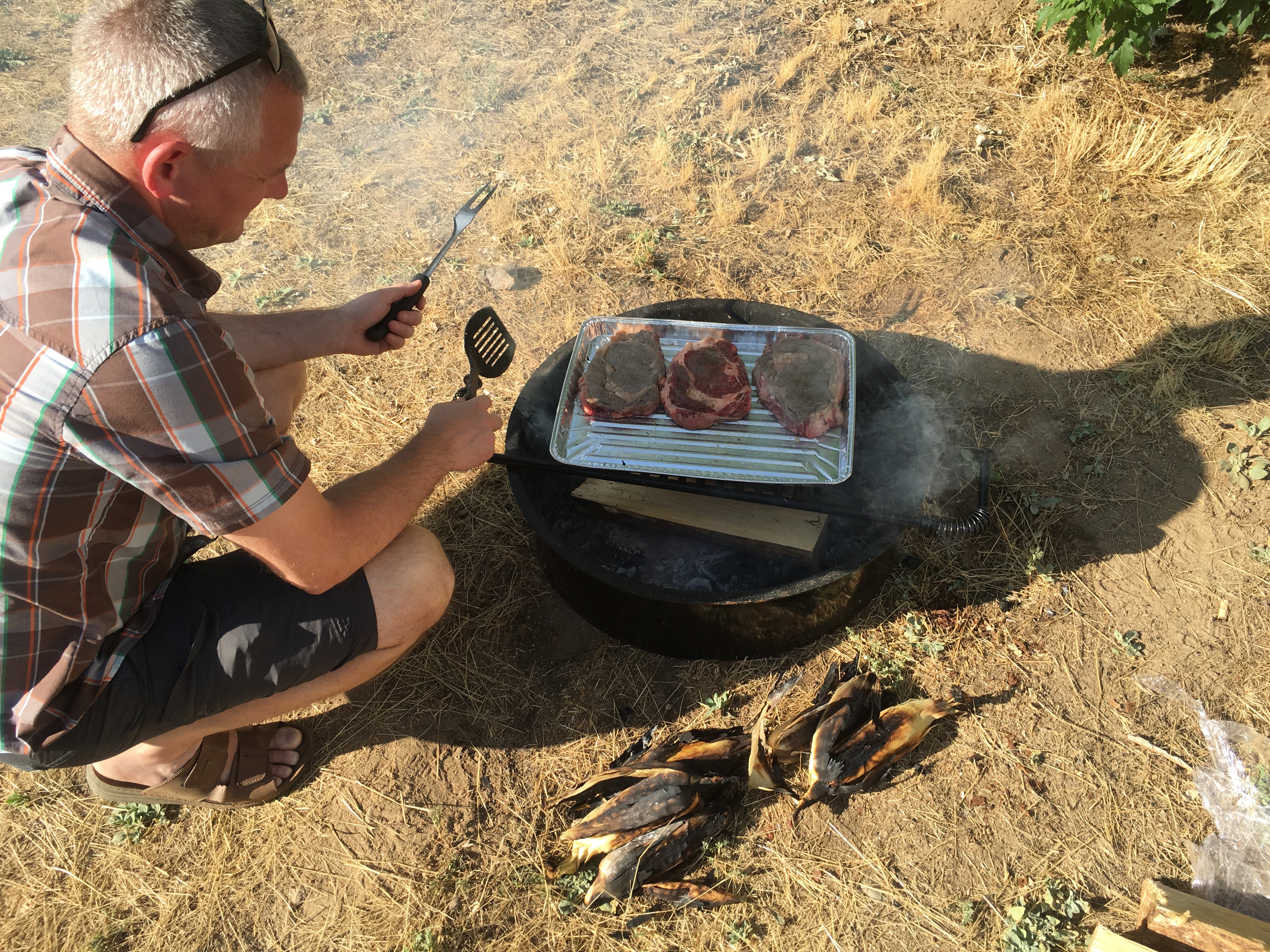 Friske majs og store bøffer – tak for inspiration til grillmad. Det ser også ud til at I skal passe på med gløder i det tørre græs – her er det ganske risikofrit at tænde bål, da der har været bygevejr i flere dage og I dag har det så regnet HELE dagen, så vores lille å/sø i hækken er tilbage – så I går ikke glip af noget her!