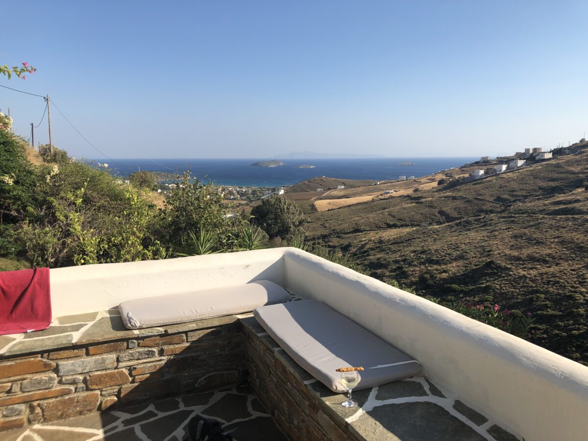 Sejlturen tog kun lidt over en time, men Andros er bestemt anderledes end Tinos. Mere landlig og mere grøn, og med en del bumlede grusveje. Vores billeje var blevet opgraderet til en firehjulstrukken Audi, nu med motor, i modsætning til den vingeskudte Fiat Dopplo vi kørte i på Tinos. Det blev vi meget glade for, da vi skulle ned til vores bolig! Dopploen var ikke kommet op igen!!