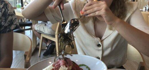 Denne gang oplevede vi et nyt højdepunkt: Overtjener i stramtsiddende t-shirt rider først med egen baby og så med restaurantens børn:
