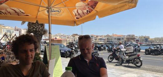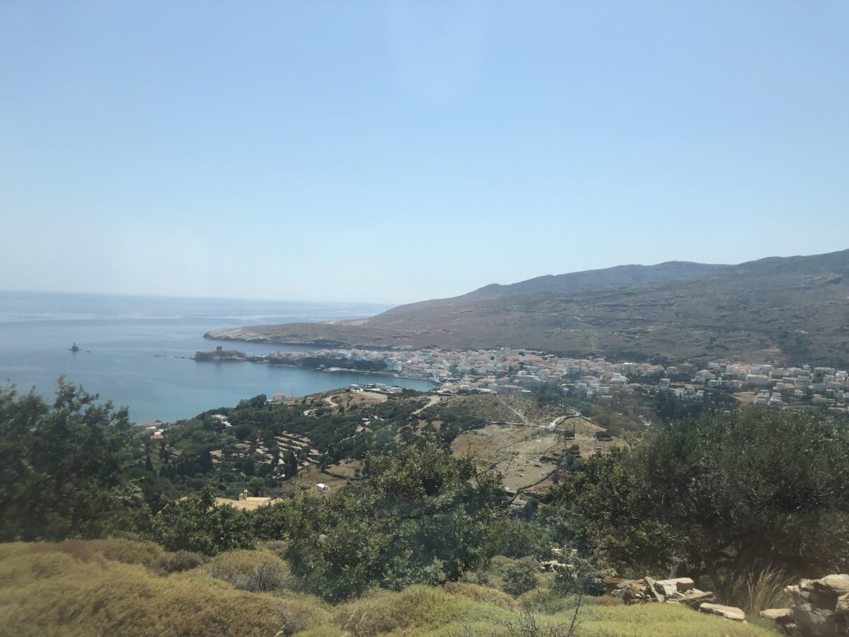I dag var det endnu varmere og ingen vind, så vi udskiftede den planlagte vandretur med en køretur til hovedbyen på Andros, Chora/Andros Town.