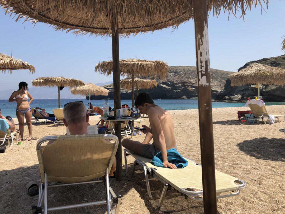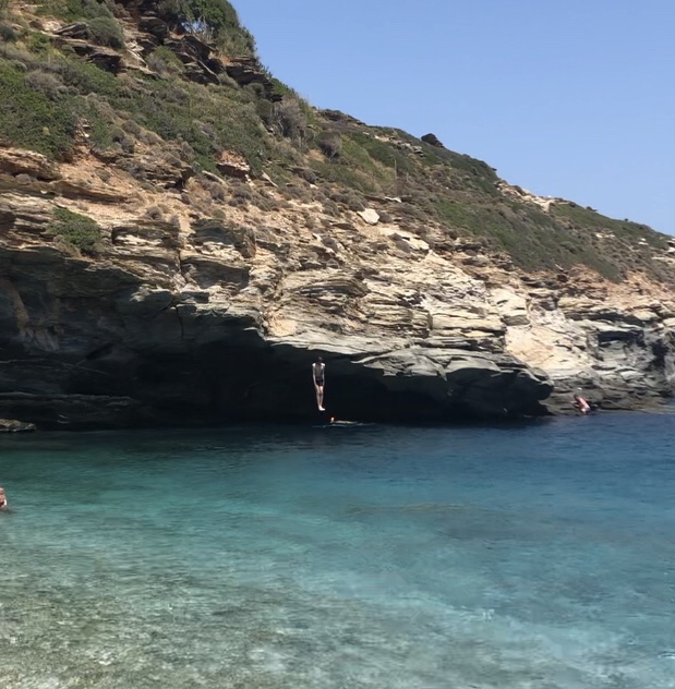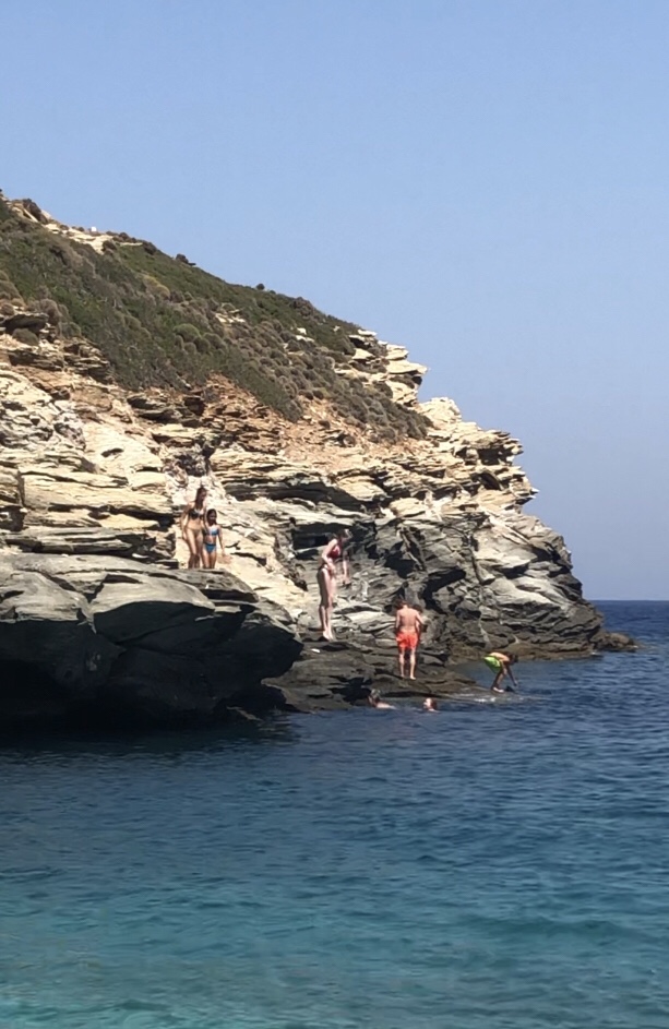Efter frokost hjemme og siesta tog vi turen til den bedste strand endnu: Vitali. Vi lejede liggestole og parasol og var der i et par timer. Jeg fik en perfekt hvid Sangria – hilsen til Asbjørn! – og Dagmar og Buster sprang ud fra nogle klipper: