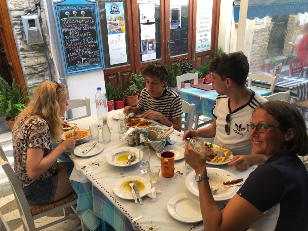 I Tinos skulle vi vente ca. 3 timer, så vi gik med alt vores bagage op til den gode græske restaurant vi var på for 6 dage siden og blev budt velkommen og fik at vide, at vi kunne bare slappe af hos dem indtil vi skulle med færgen.