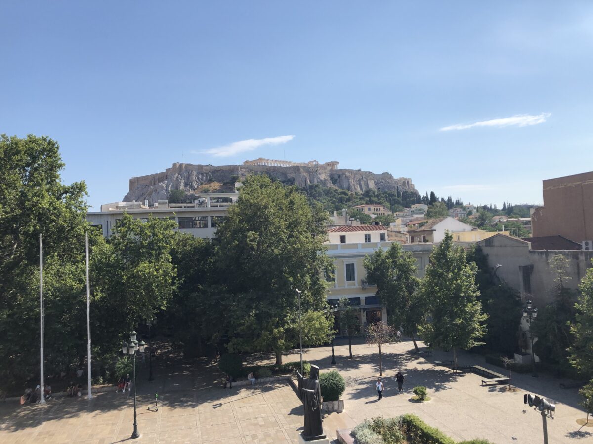 Vi kom til Rafina lidt over fire om eftermiddagen, hvor en venlig taxachauffør ventede på os. Han kørte os til vores hotel, som ligger midt i Athen, her er udsigten fra hotelværelset: